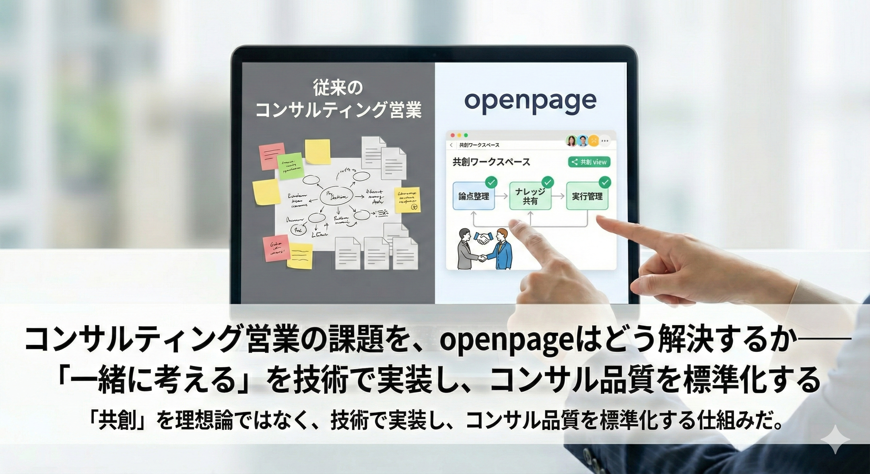 openpageは、この「一緒に考える」プロセスを技術で実装し、組織の標準として定着させる。議事録の分散、論点の属人化、提案と実行の分断。これらの構造的課題を解決することで、コンサルティング営業の品質を底上げする。