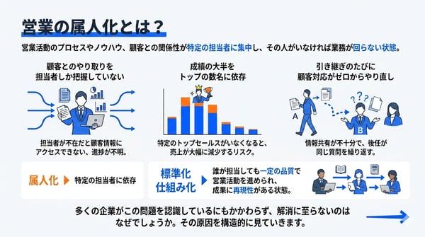 たとえば、顧客とのやり取りを担当者しか把握していない、成績の大半をトップの数名に依存している、引き継ぎのたびに顧客対応がゼロからやり直しになる——。これらはすべて属人化の典型的な症状です。