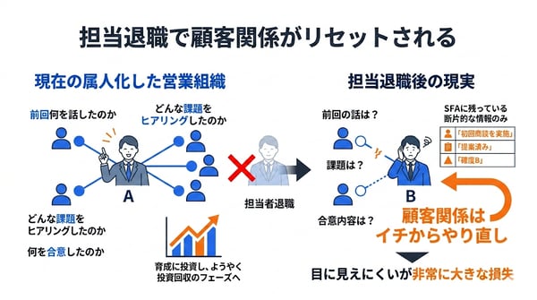 属人化した営業組織では、担当者の退職が顧客関係の断絶に直結します。