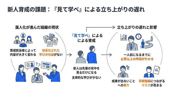 属人化が進んだ組織では、育成も属人的になりがちです。教える側が誰になるかで内容が大きく変わり、体系化された学びの仕組みがないため、新人が一人前になるまでに必要以上の時間がかかる。その間に成果が出ないことへの焦りが募り、早期離職につながるケースも少なくありません。