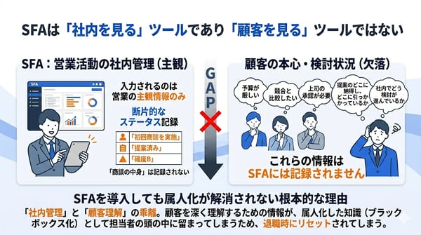 SFAに入力されるのは、あくまで営業側の主観です。顧客が本当に何を考えているか、社内でどう検討が進んでいるか、提案のどこに納得し、どこに引っかかっているか。これらの情報はSFAには記録されません。SFAは営業活動を社内で管理するツールとしては優れていますが、「顧客を見る」ためのツールとしては設計されていない。このギャップが、SFAを導入しても属人化が解消されない根本的な理由です。