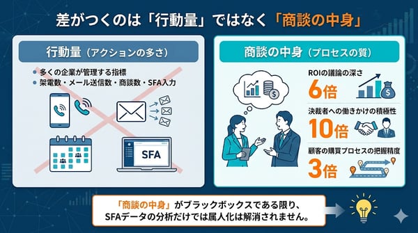 属人化の解消を考えるとき、多くの企業はまず行動量の管理に目を向けます。しかし実際にトップ営業と平均的な営業の差を分析すると、差がついているのは行動量ではなく、1回1回の商談の中身です。当社の支援先企業のデータでは、ROIの議論の深さで6倍、決裁者への働きかけの積極性で10倍、顧客の購買プロセスの把握精度で3倍の差が確認されています。