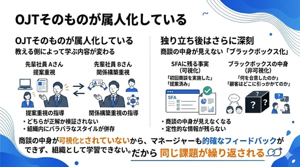 さらに見落とされがちなのが、育成の仕組みであるOJT自体の属人化です。先輩社員による同行・指導が基本ですが、教える側が誰かで新人が学ぶ内容がまったく変わります。Aさんに教われば提案重視、Bさんなら関係構築重視。どちらが正解かの検証もされないまま、組織内にバラバラなスタイルが併存します。