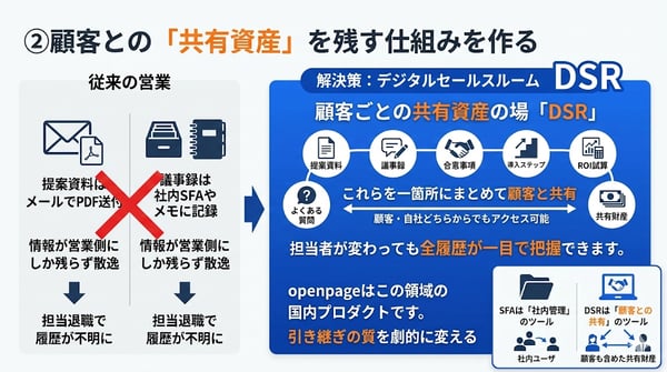 この考え方を実現するのがDSR(デジタルセールスルーム)というカテゴリで、openpageはこの領域の国内プロダクトです。SFAが「社内管理」のツールであるのに対し、DSRは「顧客との共有」を前提に設計されています。営業の頭の中にしかなかった情報を、顧客も含めた共有財産として残す。この仕組みがあるだけで、引き継ぎの質は劇的に変わります。