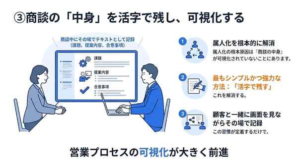 ③商談の「中身」を活字で残し、可視化する