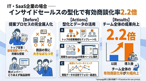 この企業がまず取り組んだのは、トップ営業の提案構成をテンプレート化すること。さらに、顧客への提案をopenpageの専用ページに集約し、閲覧データを活用してフォローのタイミングを最適化。その結果、チーム全体の有効商談化率が2.2倍に向上しています(openpage導入企業の実績データ)。