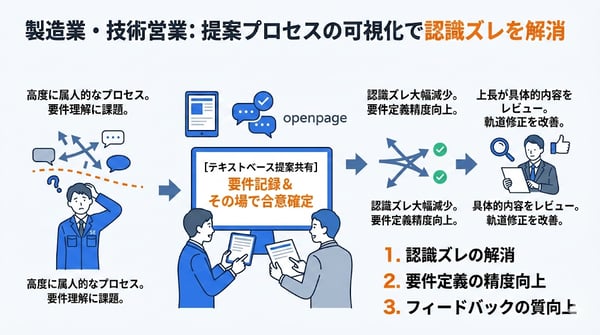 ある技術営業組織では、openpageを活用し、提案内容をテキストベースで顧客と共有する運用を導入。商談中に顧客と一緒に画面を見ながら要件を記録し、合意内容をその場で確定させることで、「後から言った言わない」の認識ズレが大幅に減少し、要件定義の精度が向上しました。加えて、上長やマネージャーが提案内容を具体的にレビューできるようになったことで、独り立ち後の軌道修正も改善しています。