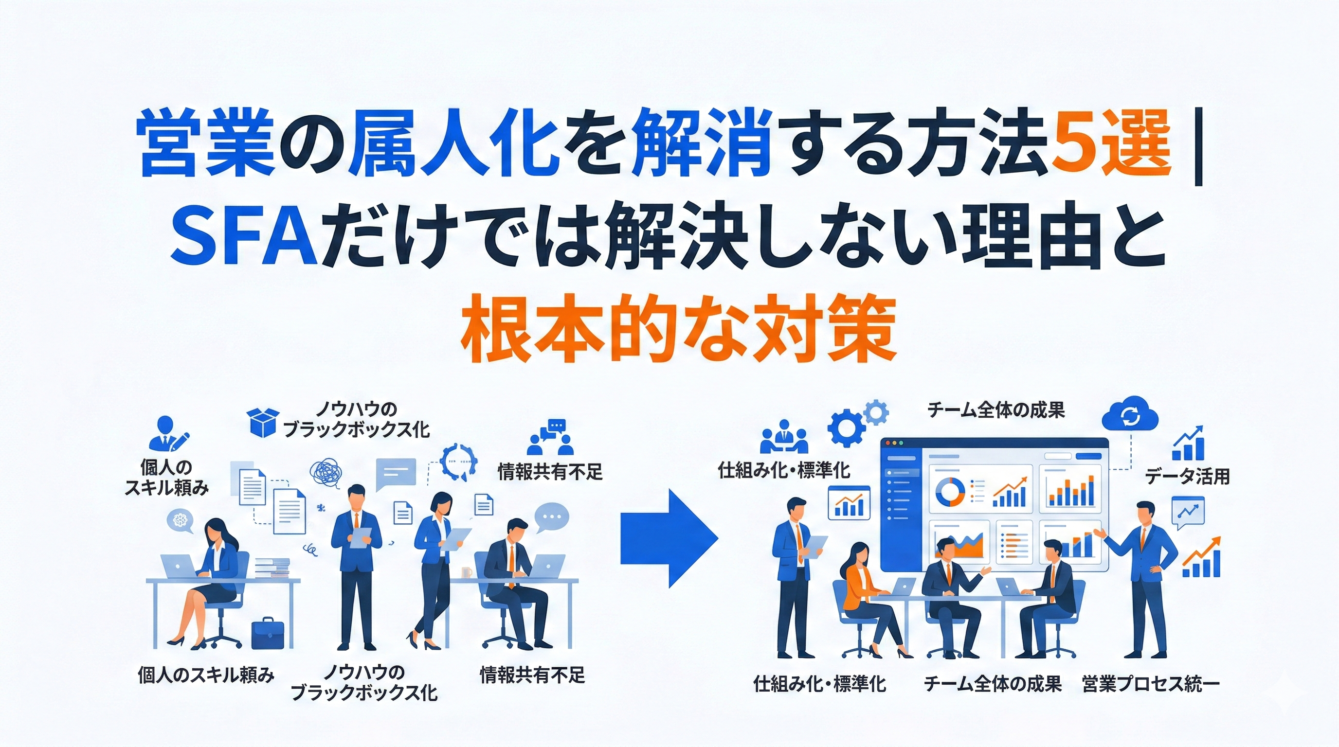 営業の属人化は、多くの企業が長年抱える構造的な課題です。しかし、その解消策として「SFAを入れよう」「マニュアルを作ろう」だけでは不十分であることを、本記事では詳しく見てきました。