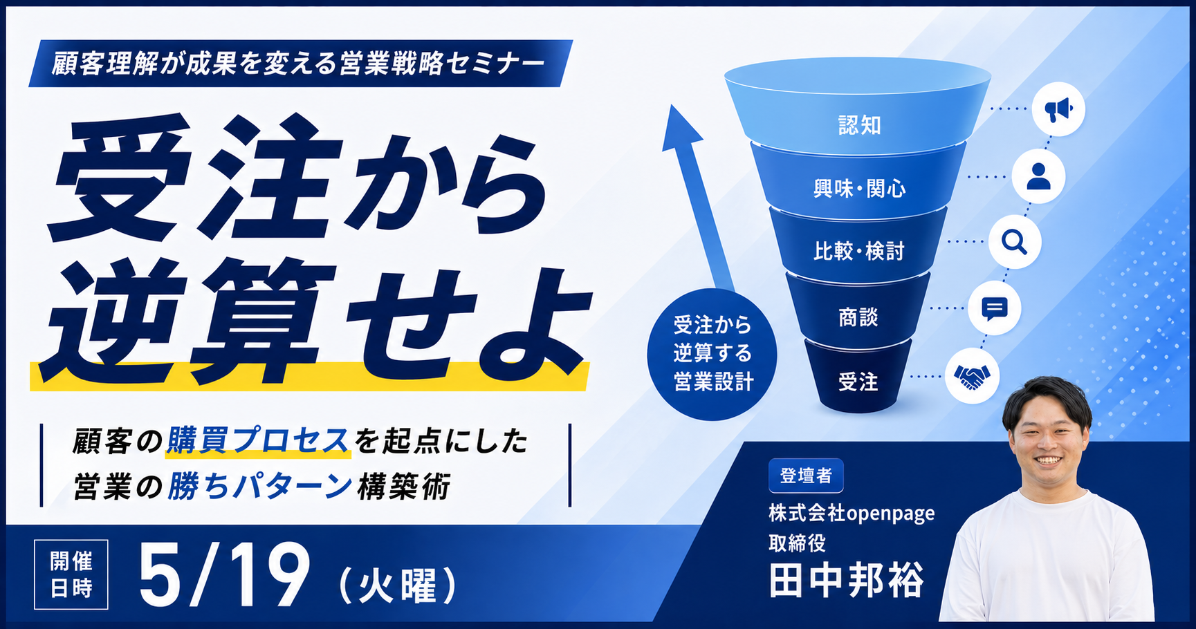 本セミナーでは、この構造的な課題に対して「受注からの逆算」というアプローチを提示します。受注とは、顧客が社内のあらゆる壁を越えきった状態です。であれば、営業プロセスの設計は「顧客が社内でどんな壁にぶつかるか」を起点に、「その壁を越えるために営業は何をすべきか」を逆順に組み立てるべきではないでしょうか。